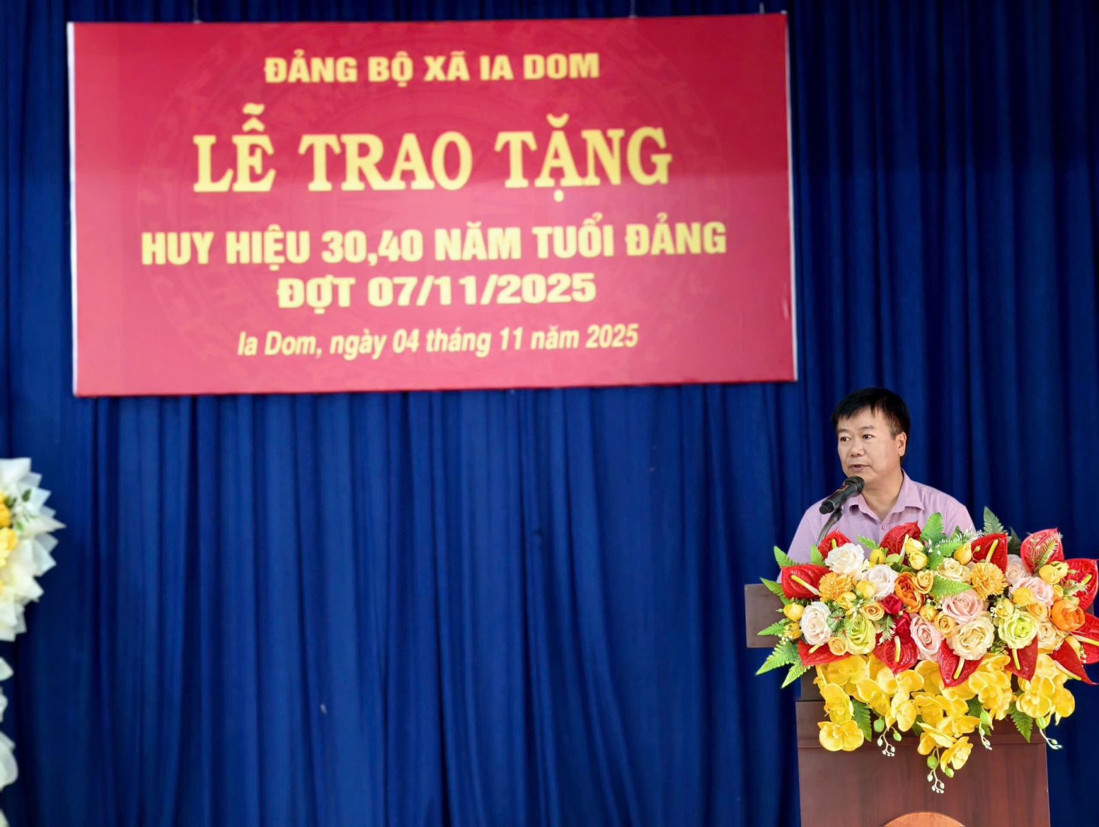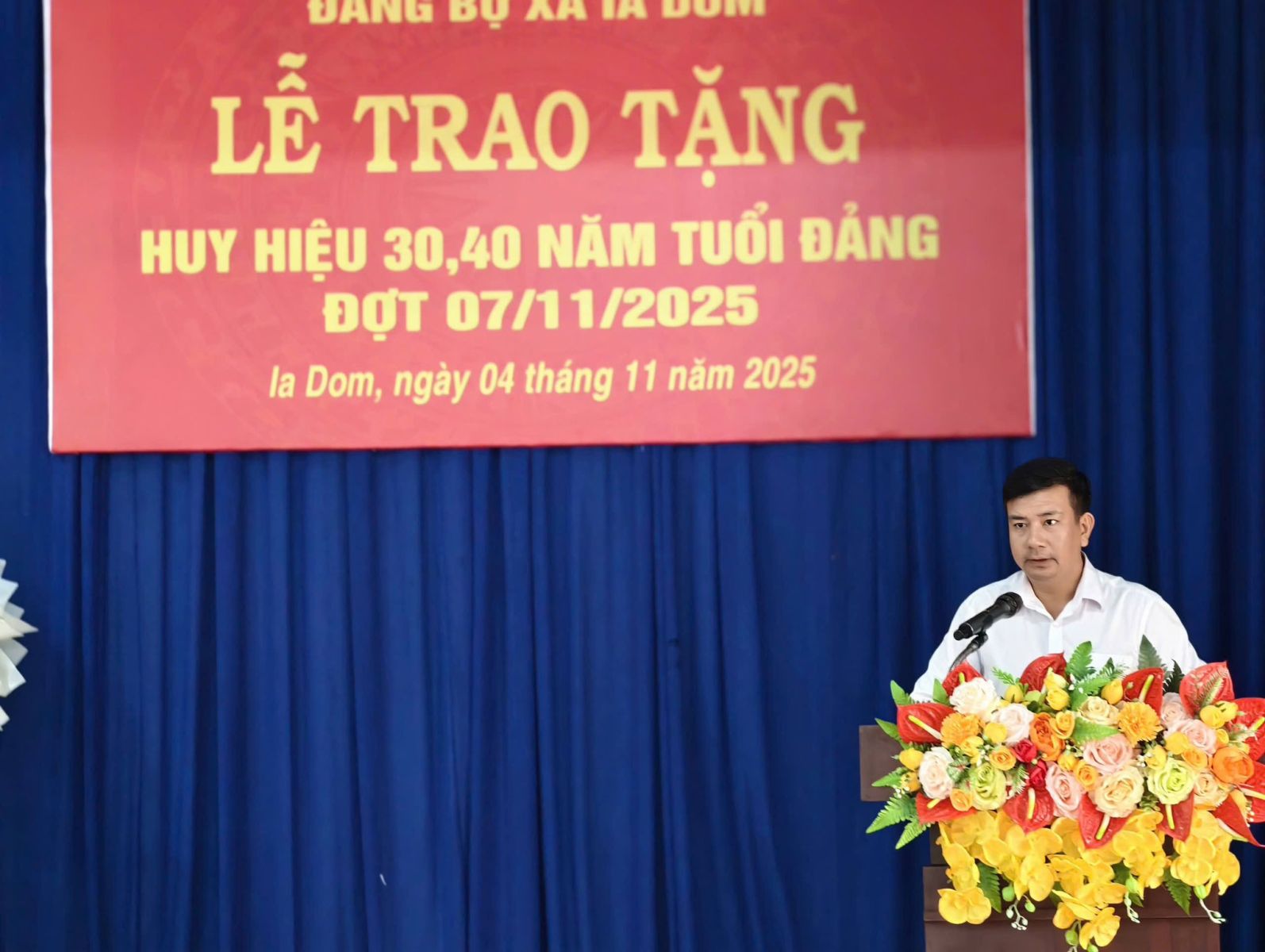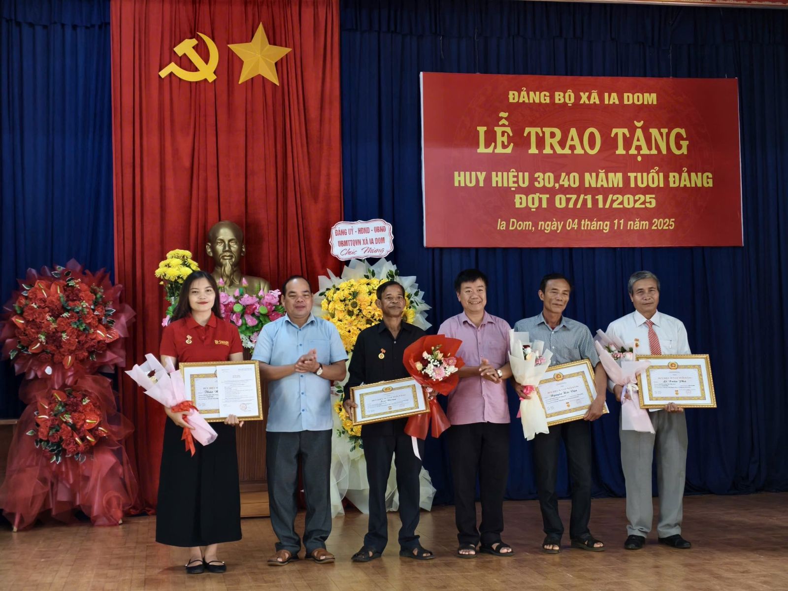 Sáng ngày 4-11, Đảng bộ xã Ia Dom đã tổ chức lễ trao tặng huy hiệu Đảng cho 4 đảng viên nhân dịp kỷ niệm 108 năm cách mạng tháng Mười Nga. Trong đợt này, Đảng bộ xã Ia Dom có 4 đồng chí được trao tặng Huy hiệu Đảng, gồm: 3 đồng chí được nhận Huy hiệu 40 năm tuổi Đảng là các đồng chí Lê Xuân Phả, Thảo Nay Nguyên, Nguyễn Hải Vân và 1 đồng chí được nhận Huy hiệu 30 năm tuổi Đảng là đồng chí Siu Dong. Thay mặt Ban Thường vụ Đảng ủy, đồng chí Trần Ngọc Phận – Bí thư Đảng ủy, Chủ tịch Hội đồng nhân dân xã đã trao Huy hiệu, tặng hoa chúc mừng và ghi nhận những đóng góp quan trọng của các đồng chí đảng viên trong suốt quá trình công tác, cống hiến cho sự nghiệp cách mạng của Đảng và sự phát triển của địa phương. Phát biểu tại buổi lễ, đồng chí Trần Ngọc Phận- Bí thư Đảng ủy xã, chủ tịch HĐND xã khẳng định việc trao tặng Huy hiệu Đảng thể hiện sự trân trọng, ghi nhận của Đảng đối với quá trình rèn luyện, phấn đấu của mỗi đảng viên; đồng thời là niềm vinh dự, tự hào không chỉ của cá nhân mà còn của toàn thể Đảng bộ và nhân dân xã Ia Dom. Đồng chí cũng mong muốn đảng viên sẽ tiếp tục cống hiến cho sự nghiệp xây dựng Đảng, xây dựng quê hương phát triển kinh tế xã hội của địa phương và giáo dục truyền thống cho thế hệ trẻ và là tấm gương sáng cho con cháu noi theo./. .jpg)