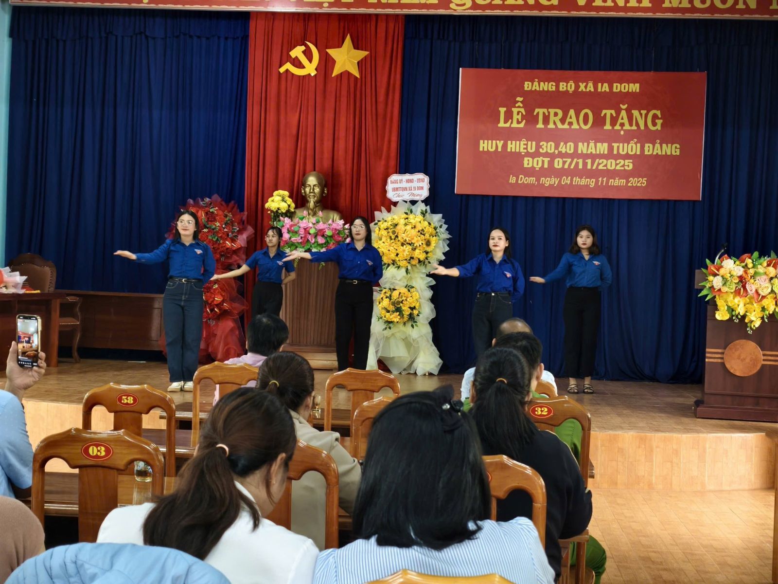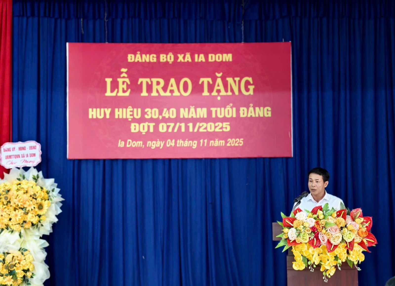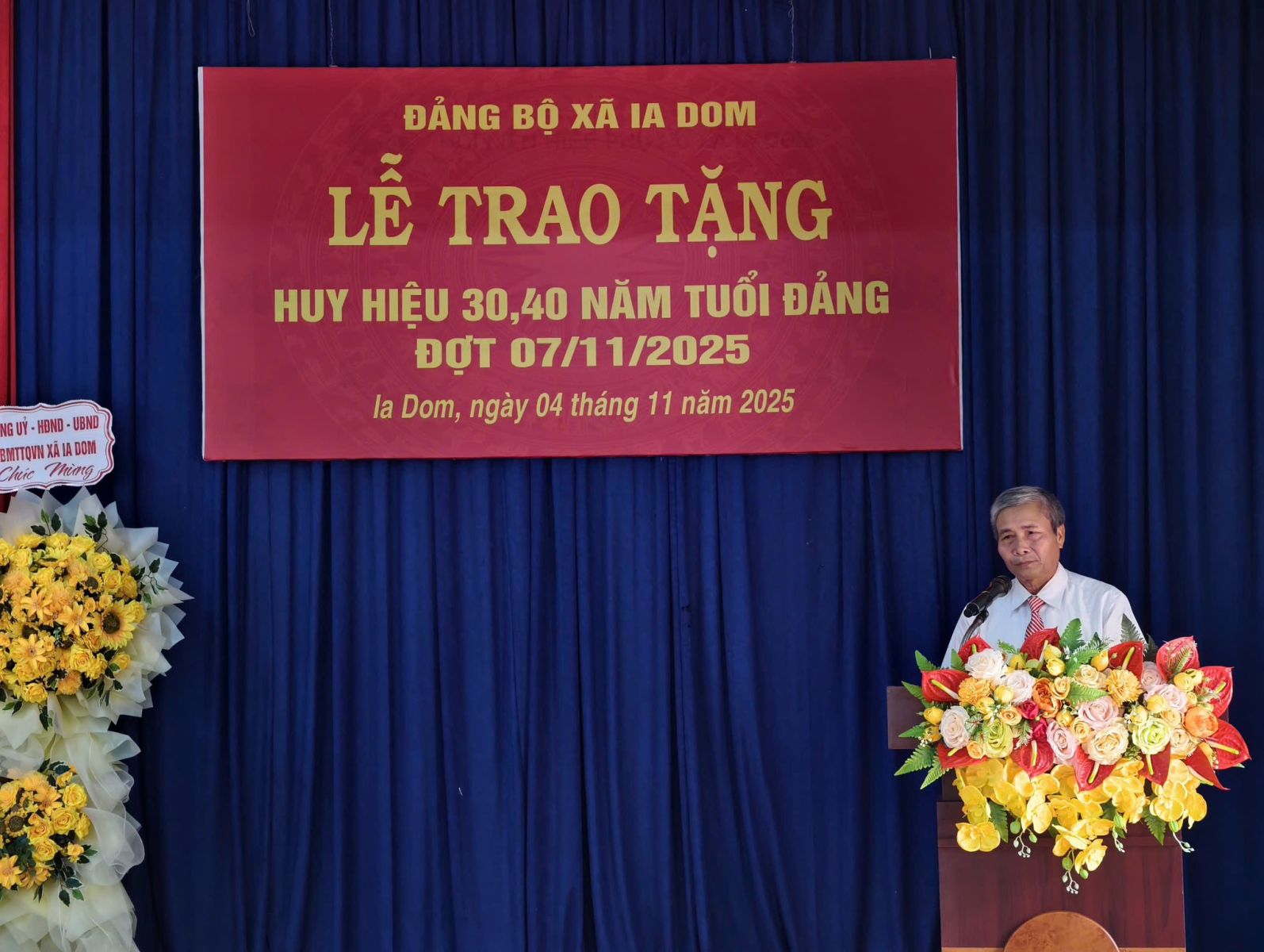 Sáng ngày 4-11, Đảng bộ xã Ia Dom đã tổ chức lễ trao tặng huy hiệu Đảng cho 4 đảng viên nhân dịp kỷ niệm 108 năm cách mạng tháng Mười Nga. Trong đợt này, Đảng bộ xã Ia Dom có 4 đồng chí được trao tặng Huy hiệu Đảng, gồm: 3 đồng chí được nhận Huy hiệu 40 năm tuổi Đảng là các đồng chí Lê Xuân Phả, Thảo Nay Nguyên, Nguyễn Hải Vân và 1 đồng chí được nhận Huy hiệu 30 năm tuổi Đảng là đồng chí Siu Dong. Thay mặt Ban Thường vụ Đảng ủy, đồng chí Trần Ngọc Phận – Bí thư Đảng ủy, Chủ tịch Hội đồng nhân dân xã đã trao Huy hiệu, tặng hoa chúc mừng và ghi nhận những đóng góp quan trọng của các đồng chí đảng viên trong suốt quá trình công tác, cống hiến cho sự nghiệp cách mạng của Đảng và sự phát triển của địa phương. Phát biểu tại buổi lễ, đồng chí Trần Ngọc Phận- Bí thư Đảng ủy xã, chủ tịch HĐND xã khẳng định việc trao tặng Huy hiệu Đảng thể hiện sự trân trọng, ghi nhận của Đảng đối với quá trình rèn luyện, phấn đấu của mỗi đảng viên; đồng thời là niềm vinh dự, tự hào không chỉ của cá nhân mà còn của toàn thể Đảng bộ và nhân dân xã Ia Dom. Đồng chí cũng mong muốn đảng viên sẽ tiếp tục cống hiến cho sự nghiệp xây dựng Đảng, xây dựng quê hương phát triển kinh tế xã hội của địa phương và giáo dục truyền thống cho thế hệ trẻ và là tấm gương sáng cho con cháu noi theo./. .jpg)